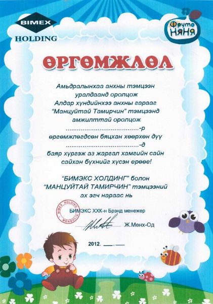 Ерөөсөө ч тэмцээнд заавал түрүүлнэ гэсэн зорилго огт тавиагүй л дээ. Иймдээ ч хэдэн сарын өмнөөс Манцуйтай тамирчинд хүүгээ оруулна гэж ярьсан мөртөө хөлд оруулагч аваагүйн дээр ажлын зав чөлөө гарсан дээр нь хэмээн 9 сартайд нь оруулчихсан юм. Одоо манай хүү өөрөө л юм түшиж босоод хөлөө зөөгөөд алхдаг болсон. Түүнээс биш аав ээж хоёр нь хөтлөөд алхуулж байгаа юм бараг л алга дөө. Ямартаа л гар суганаас нь барихаар хөлөө атийлгаад газраас хөндийрөөд байх вэ дээ. Яг энэ нь бичлэгт бас л орсон байсан.