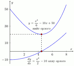 \node[below,yshift=-5mm,xshift=5mm] at (a) {\small $\dfrac{dy}{dx}=\dfrac{x^2}{2}-10$ ахиу орлого};