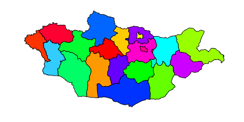 Статистикийн R програм дээр Монгол Улсын газрын зургийг аймгийн хилтэй нь хамт, өнгө ялгаж зурах
