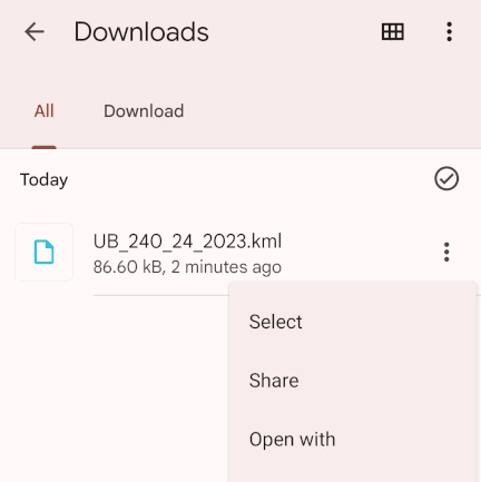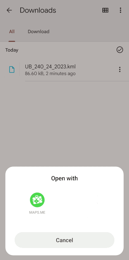 Maps.me нь KML форматтай файлыг өөр дотроосоо нээх функцгүй байсан тул уг форматтай файлыг хэрхэн тус апп руу оруулж болохыг харуулсан дэлгэрэнгүй заавар бэлдлээ. KML форматтай файлыг Maps.me руу оруулахын тулд уг файлыг тус апп-аар нээнэ. Үүний тулд "Open with" гэдэг команд ашиглаж болно.
